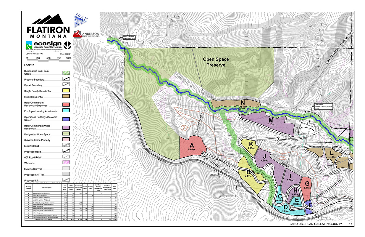 SEAK teamed with local and international developers, consultants, planners and designers to prepare the conceptual Flatiron PUD design in Big Sky Montana. SEAK led the County PUD planning entitlement efforts to secure approval of 1440 mixed unit density on 350 acres of land in Gallatin County adjacent to Big Sky resort. Planning efforts included resource identification, real estate unit mix, road alignments, solar analysis, ski in-ski out accessibility, wastewater treatment options, wastewater collection, well water development, and water distribution networks. The Gallatin County Commission approved the PUD 6:0 following a lengthy public review process. SEAK also worked with The Montana Department of Environmental Quality to secure approval for two public water well supplies on the Madison County portion of the development. Flatiron is planned as a 20-year build out. Planning and development processes are still ongoing.